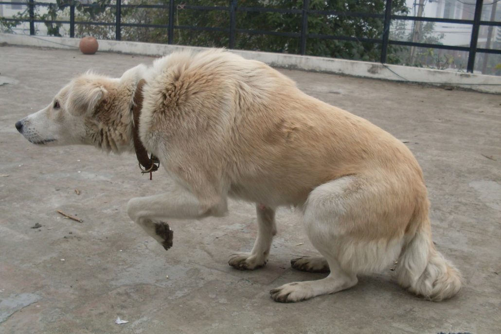 - De staart kan zich tussen de achterpoten bevinden of de staart beweegt gespannen heen en weer met een stijve kwispel.