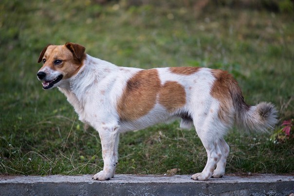 De hond is zelfverzekerd. Dit gebeurt vaak bij een ontmoeting met een andere hond. De staart wordt vrijwel niet bewogen.