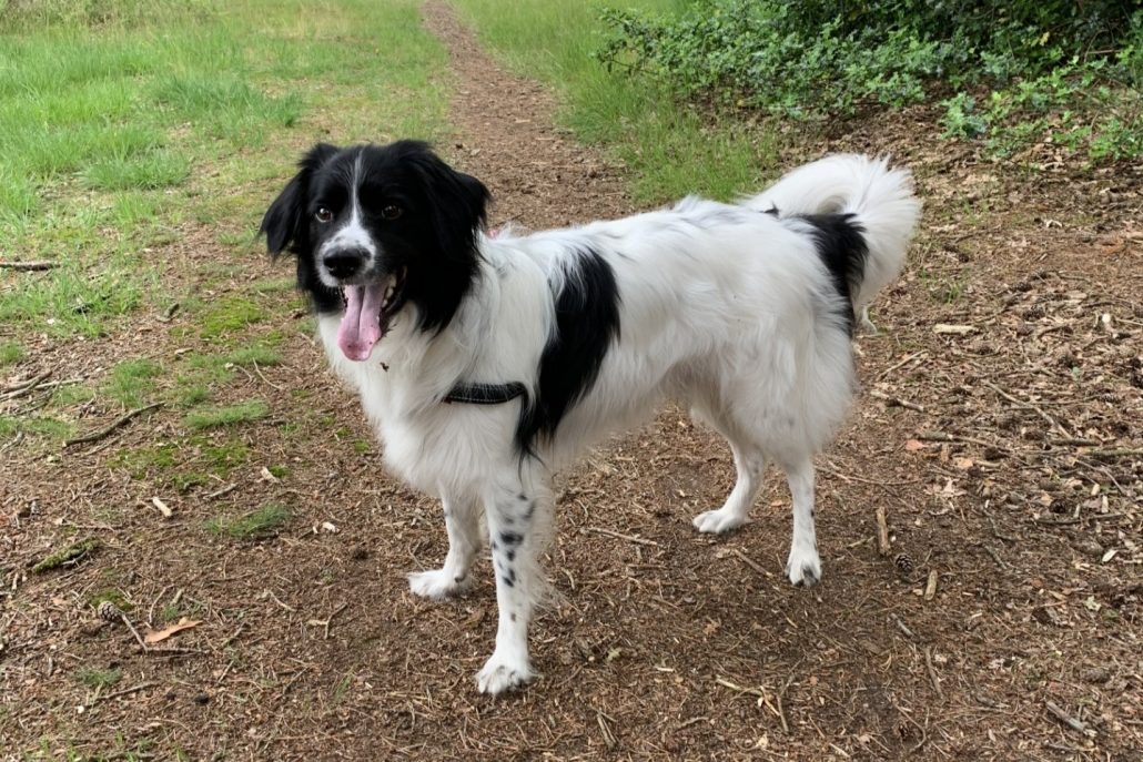 De hond is angstig. Dit gaat vaak gepaard met meerdere signalen, waaronder de ‘whale eye’ (kijk voor meer informatie hierover bij ‘Ogen’).