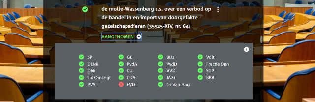 In 2020 stuurden we een concept-wetsvoorstel naar de Tweede Kamer voor een importverbod op doorgefokte honden. Minister Schouten reageerde afwijzend: “Ik kan niet zo veel doen aan honden uit het buitenland die in Nederland niet gefokt mogen worden, vanwege het vrije verkeer van mensen, goederen, et cetera. Ik moet gewoon toestaan dat dieren die uit een ander land naar Nederland komen hier verkocht worden”. De Partij voor de Dieren, de VVD en het CDA legden zich daar niet bij neer. Zij dienden een motie in waarin zij de minister vragen te onderzoeken hoe de import van doorgefokte dieren toch verboden kan worden. Nu deze motie bijna unaniem is aangenomen, kunnen er nieuwe stappen worden gezet om de gezondheid van huisdieren in Nederland significant te verbeteren.
